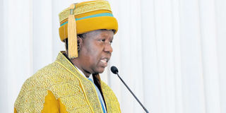 Dr Fred Matiang’i, the Education secretary, speaks at the Aga Khan University graduation ceremony on February 10, 2016. PHOTO | JEFF ANGOTE
