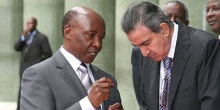 Billionaire Dawood Rawat, a Britam director, with CEO Benson Wairegi in 2013. PHOTO | FILE