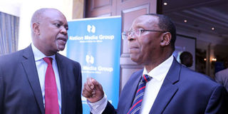 Nation Media Group's Editor-in-Chief Tom Mshindi (left) and group chairman Dr Wilfred Kiboro during an investor briefing at the Sarova Stanley on July 26, 2017. PHOTO | DIANA NGILA | NMG