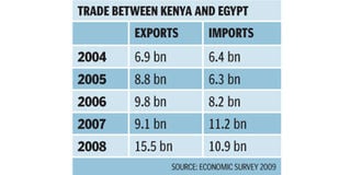 Government statistics indicate that Kenya’s exports to Egypt reached Sh15.5 billion in 2008 compared to imports of Sh10.8 billion.