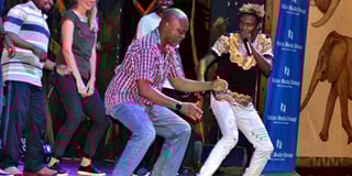 Nation Media Group Editor- in- Chief Tom Mshindi joins a member of Sarakasi Dancers in a dance.