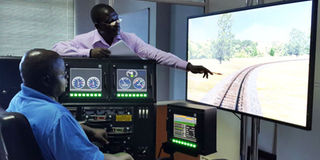 Rift Valley Railways (RVR) locomotive instructor Jacob Nguli (standing) guides Godfrey Wanga, a driver, through the controls of the train simulator. PHOTO | COURTESY
