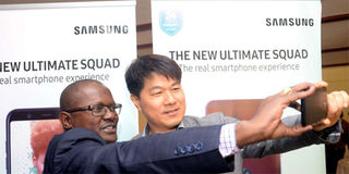 Samsung Electronics East Africa Mobile Division Director Charles Kimari (left) and Head of Mobile Business for Samsung Africa Leon Shin explore the features of the Galaxy A6+, one of the four smartphones launched by the company at Mövenpick Hotel in Nairobi on June 11, 2018. PHOTO | SALATON NJAU | NMG