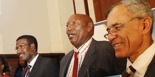 From left: Kenya Power MD Ben Chumo, Ol-ndanyat Power Ltd chairman Simon Igecha and Strathmore University DVC Izael Pereira Da Silva after signing the deal. PHOTO | DIANA NGILA