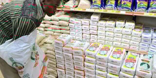 An attendant stocks maize flour on a shelf at a Nyeri supermarket. Thika-based Capwell Industries has bought the maize milling assets of Chania Flour Mills. FILE PHOTO | JOSEPH KANYI |