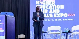 Principal Secretary for the State Department for TVET in the Ministry of Education, Dr Esther Thaara Muoria, delivers her keynote address during the Higher Education Fair and Skills Expo 2026 at the Sarit Centre Expo, Nairobi, on January 29, 2026.
