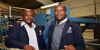 Targeter Educational Publishers’ CEO, Peter Kiarie (left), and MD Boniface Macharia at the printing plant. PHOTO | SALATON NJAU |