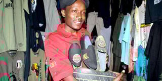 Titus Kaberia with some of the canvas shoes that he makes. PHOTO | SALATON NJAU