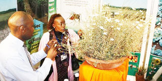 An exhibitor explains to a delegate how the pyrethrum plant is used to manufacture insecticides at the eighth Agoa meeting in Nairobi earlier in the year. Photo/FILE