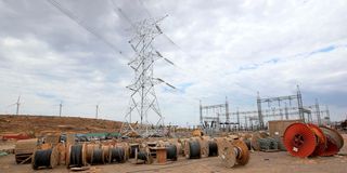 Power lines connecting pylons of high-tension electricity are seen from the power substation at the Lake Turkana Wind Power project in Loiyangalani District, Marsabit County, Northern Kenya on September 4, 2018.