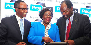 From left: Kenya Bankers Association vice-chair John Gachora, IPSL chief executive Jennifer Theuri and her KBA counterpart, Habil Olaka, during the launch of PesaLink in February. PHOTO | SALATON NJAU