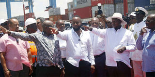 Ugandan President Yoweri Museveni (right), with Mombasa Governor Hassan Joho (centre) and KPA chairman Joseph Kibwana at berth number 20 at the Port of Mombasa last week. PHOTO | LABAN WALLOGA