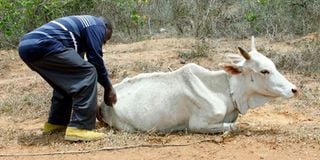 A Motorist tries remove a cow from the road as Livestock die of hunger-related conditions at Kamale area in Magarini, Kilifi County in this photo taken on 25th September 2021. PHOTO | KEVIN ODIT | NMG