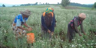 Workers harvest pyrethrum at the Kenya Agricultural and Livestock Research Organization (Kalro) in Molo, Nakuru County on August 06, 2021. PHOTO | JOHN NJOROGE | NMG