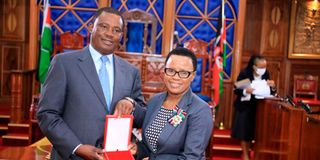 Speaker of the National Assembly Justin Muturi [L] confers Deputy Clerk, National Assembly Sarah Kioko with Moran of the Burning Spear (MBS) in this photo taken on May 17, 2022. PHOTO | JEFF ANGOTE | NMG