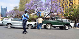 A policeman controls traffic as a vehicle is towed away from the city centre. Nairobi will outsource towing service. PHOTO | SALATON NJAU