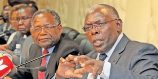 Suspended Knec CEO Joseph Kivilu (right) addresses the press in Nairobi last October. PHOTO | JEFF ANGOTE