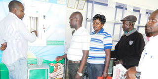 Customers queue at the Milk ATM in Eldoret town. The machine dispenses milk for as low as Sh5, with a litre costing Sh60. FILE