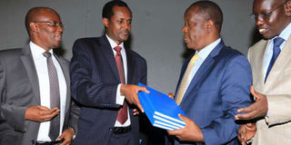 EACC chief executive Halakhe Waqo (second left) hands over the FPE funds probe report to Education secretary Fred Matiang’i in Nairobi on May 25, 2016. Looking on are EACC commissioner Paul Gachoka (left) and Education principal secretary Belio Kipsang. PHOTO | JEFF ANGOTE