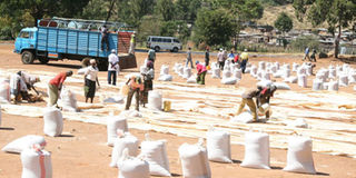 Farmers drying maize in Eldoret. The minister said 200,000 acres will be under sugar cane, 500,000 acres for maize and 150,000 acres for ranches. FILE