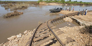 A Malawi Defence Force marine boat awaits on January 21, 2015 to rescue victims of floods who were trapped by the waters, at a Shire River distributary which resulted when the country's largest river flooded and breaking a railway and road connecting Makhanga and Bangula, rendering them incommunicable. AFP PHOTO | AMOS GUMULIRA