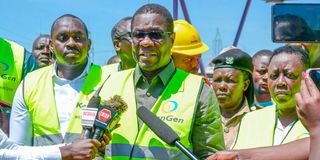 Cabinet Secretary of Energy and Petroleum James Opiyo Wandayi (right) addressing the media during his tour of Muhoroni Gas Turbine (GT) Power Plant in Kipsitet on October 5, 2024.