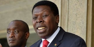 Water secretary Eugene Wamalwa (right) with National Water Corporation board chairman Julius Kones at a media briefing in Nairobi on February 4, 2016. PHOTO | SALATON NJAU
