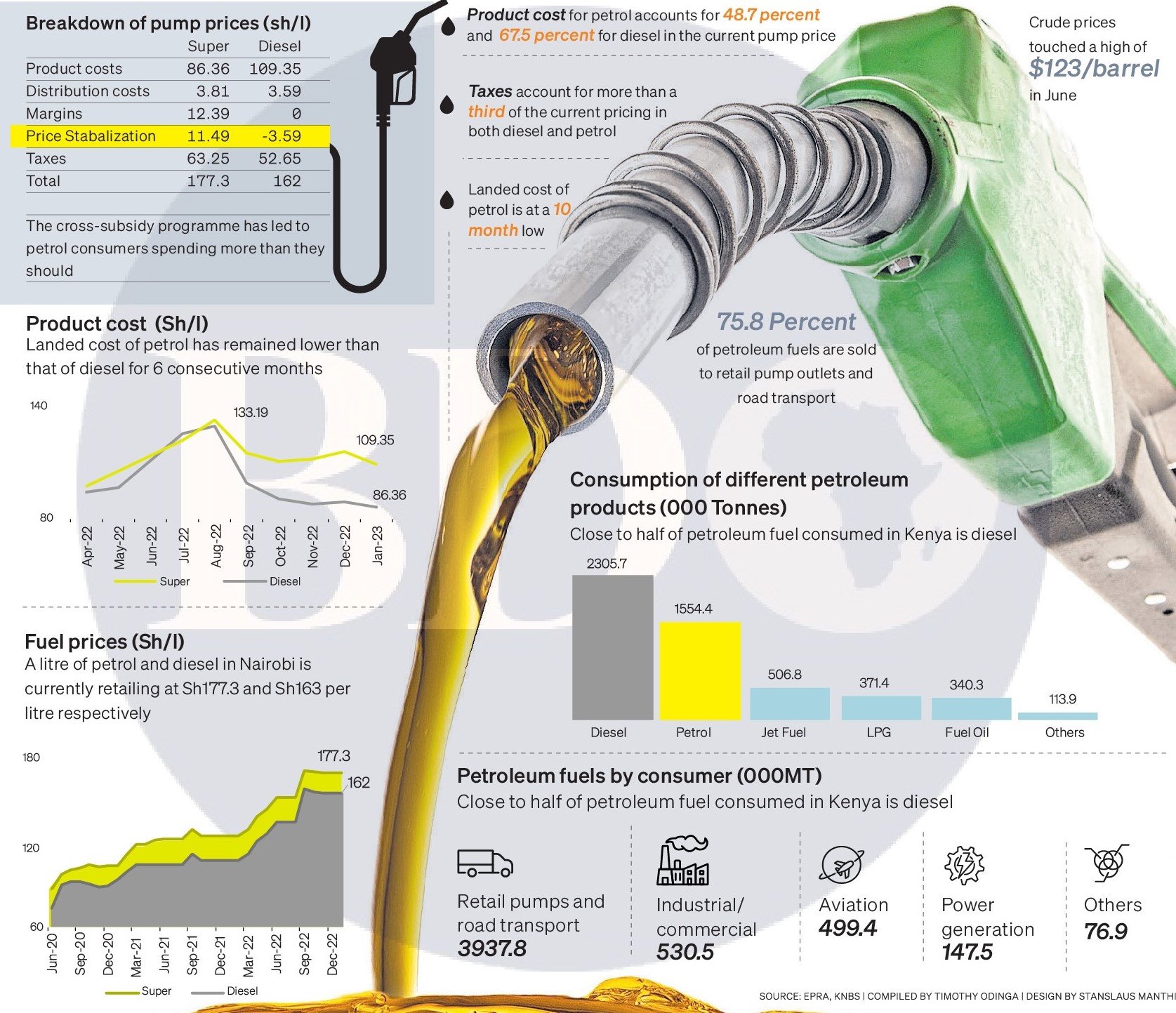 The cross-subsidisation — where one product is priced higher and its proceedings are used to keep another product’s price lower — has kept diesel prices at Sh162 per litre while super petrol remains at Sh177.3 per litre.