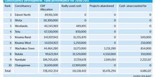 An audit conducted by the National Taxpayers Association (NTA) in 10 constituencies indicates that Sh92 million, or 13 per cent of funds allocated for projects in 2010/11, went down the drain.