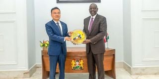 President Ruto receives a panda plate from China Communications Construction Company President Zhang Bingman at State House, Nairobi.