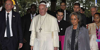 Pope Francis walks with the Director-General of the United Nations Office at Nairobi (UNON) Sahle-Work Zewde (right) upon his arrival at the United Nations office in November 26, 2015. AFP PHOTO / POOL / SIMON MAINA