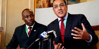 Najib Balala, Kenya’s Mining secretary and Seamic’s chairman (right) and the African Union Commission (AUC) senior industry adviser Frank Mugyenyi address the press during the Governing Council meeting of Southern and Eastern Africa Mineral Centre (Seamic) at the Intercontinental Hotel in Nairobi on June 4, 2014. Photo/SALATON NJAU