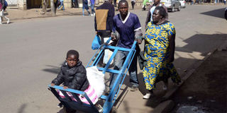 A cart pusher and a pedestrians walk in Nairobi after a ban on matatus accessing the CBD on December 3, 2018. PHOTO | SALATON NJAU | NMG