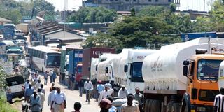 Trucks at Kenya’s Malaba border point transport goods to Uganda. Kenya-Uganda border has in recent months been experiencing congestion that left businesses with huge operational costs and disruptions due to delayed shipments.
