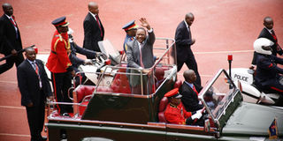 President Uhuru Kenyatta arrives at the Kasarani Stadium for the Jamhuri Day celebrations on December 12, 2013. Photo/PHOEBE OKALL