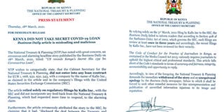 Editor's note: A screengrab of the statement from the National Treasury denying the existence of the loan agreement between Kenya and Canadian firm Kallo Inc and Belarusian company Techno-Investment Module (TIM).