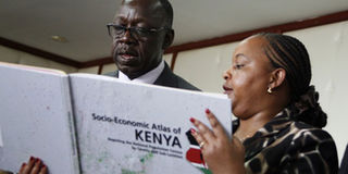 Devolution and Planning Cabinet Secretary Ann Waiguru and Planning Principal Secretary Peter Mangiti peruse the Kenya socio-economic atlas. PHOTO | EVANS HABIL | NATION MEDIA GROUP