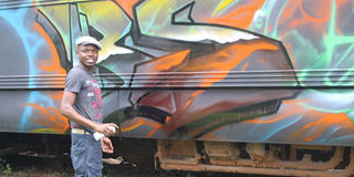 Swift Elegwa spray painting the old train wagon. PHOTO | MARGARETTA WA GACHERU | NMG