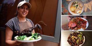 Head Chef of Duck House, Anjili Shah, showcasing cooked Ayam Cemani Black Chicken (left), Pork Miso Ramen (top right), stir-fried crab pieces (mid right), and wood ear mushrooms (black fungus) at Duck house in Runda, Nairobi on January 19, 2026.