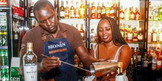 Mixologist Peter Kinyua (left) making a Mint Julep cocktail while being assisted by Macallan Single Malt Scottish Whisky Brand Ambassador Sherlyne Muita at Ibury Lounge in Nairobi on October 7, 2021. PHOTO | FRANCIS NDERITU | NMG