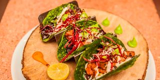 His slow-roasted lamb tacos served with lime crema dish are a feast for the stomach and the eye.
