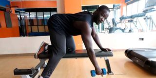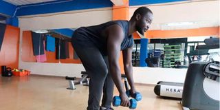 Tim's Health and Fitness Centre trainer Byron Majumbe demonstrating dumbbell row at the Rongai facility on July 26, 2022. PHOTO | DIANA NGILA | NMG