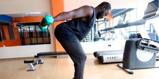 For beginners, Majumbe advises that you start with light-weight dumbbells, of say, five kilogrammes. Grab two dumbbells of equal weight on each hand and assume a straight bending posture. Lift the double weights until above your head and repeat this about 10 times. “This workout helps to straighten the lateral muscles.”