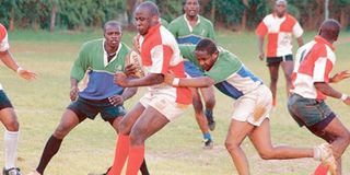 Impala Club’s Paul Oimbo is tackled by KCB players during a friendly game. The home team beat KCB 31 -14 to lift the Impala Floodlit Trophy at the weekend.