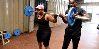 Miriam Nabakwe with her trainer Collins Musera at the Homeboyz Fitness Centre at the Ligi Ndogo grounds in Nairobi. PHOTO | Diana Ngila | NMG