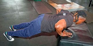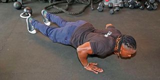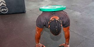 Emmanuel Wekesa a fitness trainer at Advanced fitness in South B, Nairobi demonstrating how to do a weighted pushup on June 1, 2022. PHOTO | LUCY WANJIRU | NMG