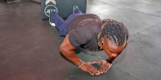 Emmanuel Wekesa a fitness trainer at Advanced fitness in South B, Nairobi demonstrating how to do a standard pushup on June 1, 2022. PHOTO | LUCY WANJIRU | NMG