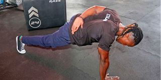 Emmanuel Wekesa a fitness trainer at Advanced fitness in South B, Nairobi demonstrating how to do a one-arm pushup on June 1, 2022. PHOTO | LUCY WANJIRU | NMG