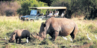 Early morning game drive with rhinos in the foreground. Photo/Elsa’s Kopje