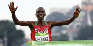 Rio Olympics Games marathon gold medallist Eliud Kipchoge crosses the finish line. PHOTO | AFP